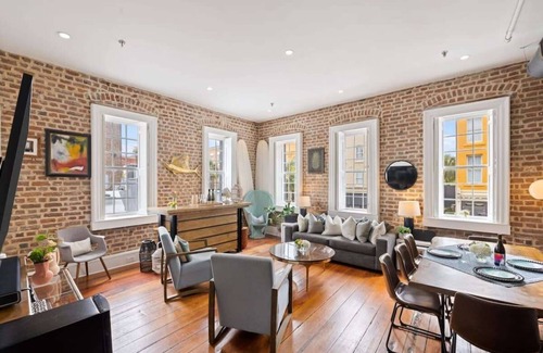 The gracious living room features exposed interior brick, original heart pine hardwood floors and 18' ceilings. The dining area features a live-edge dining table with seating for 8 plus, a full bar with seating for 4 more and ample seating for additional guests throughout. A high-end SONOS sound system controlled by iPad and a 75" flat screen TV with premium channels lend to a common area perfect for comfortably entertaining up to 14 guests.
