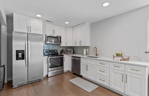 Step into a world of coastal elegance as you enter our thoughtfully designed home. The living area is bathed in natural light, featuring an open layout that promotes togetherness. Relax on plush furnishings, or gather around the large dining table for a memorable meal prepared in the fully-equipped kitchen. With quartz countertops, modern appliances, and ample space, cooking becomes a joy.