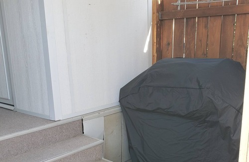 The covered deck has comfortable couch and a dining set. Fenced newly remodeled back yard, with barbeque grill.