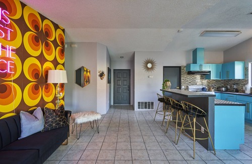 Bring the whole group for a retro getaway at "The Place" - complete with large pool, PacMan arcade game, ping pong, darts and of course a full kitchen! Every bedroom features a large 60-in 4K TV and the living boasts a 70-in 4K TV. The back yard oasis includes a large pool, newly-planted date palms trees, an outdoor dining space, and plenty of lounging furniture plus corn hole and Connect4 yard games! "The Place" is centrally located in Indio just minutes from restaurants, markets, and more!