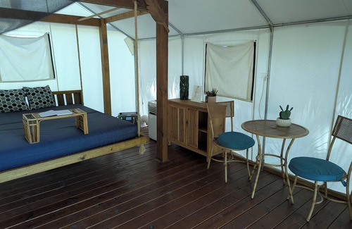 Stay in a cozy glamping tent. Enjoy relaxing at our beautiful pool, free Wi-Fi, laundry facilities, and clean private bathrooms with showers.
