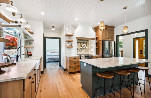 The Porch House is family-friendly, with space to spread out both indoors and outdoors. Enjoy leisurely walks through the wooded property, spot local wildlife, or take a short stroll to nearby shops and eateries. The home’s secluded setting offers privacy and tranquility, perfect for unwinding after a day of adventure.