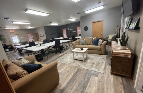 Lots of room to hangout, do craft projects, meet or just relax. The studio portion contains office chairs and 6 ft tables for working plus a couch and love seat for relaxing or watch TV or movies on DVD. Easy access, pull right up to the door to unload. Plenty of parking available. Bonus for scrapbookers, there is a scrapbook store on site.