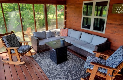 The Rainbow Cabin is a 2 bedroom, 1 bath duplex style cabin with an open-concept living, dining, and fully equipped kitchen. The master bedroom has a king-size bed and sliding glass doors with an amazing view of the river. The second bedroom has a queen bed and two twin rollaway beds. There is a walk-in shower in the large, handicap accessible bathroom. Enjoy the screened-in porch for dining, porch sitting, or napping in the hammock while the river rolls by! The screened-in porch leads to a large open deck with a grill and there is a fire pit in the yard. The entire lodge can be booked along with our listing of The Brown Cabin 1.