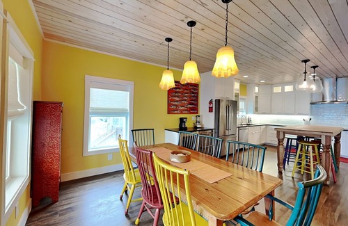 Inside, the open-concept main floor features a bright and inviting living room with ample seating around the smart TV, a fully equipped kitchen with a breakfast bar, and a dining area ready for group meals. Each bedroom is thoughtfully placed: a king suite and a queen suite on the second floor, a queen bedroom on the ground level, and a third-floor loft-style bunk room—ideal for kids or larger groups—with a full bathroom. A wine cooler adds a touch of sophistication for relaxing evenings.