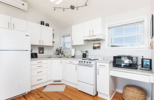 The kitchen is equipped with essential appliances and ample counter space, perfect for preparing meals while taking in the ocean view.