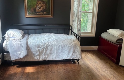 In the finished basement you'll find a cozy full bed. Relax and unwind in this charming home, complete with amenities like a washing machine, heating, AC, and WiFi.