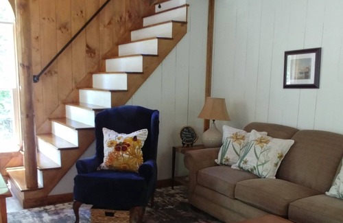 Beautifully decorated 2 yr.old cottage very cozy, beautiful wrap around covered porch with patio furniture and rocking chairs picnic table, charcoal grill,plenty of room to enjoy Your self no matter the weather. fire pit, wooded lot, spacious shower, large dining table,Sleeping loft with full size bed downstairs bedroom has a queen size bed,washer and dryer, dishwasher, WiFi is included along with a Smart tv for streaming This place accommodate five people, sleeps 4 with a nice cot for a 5th person , 5 miles from nolin lake state park, and beach and hiking trails 10 min from blue holler mud rides and 4 wheeler trails,30 min from mammoth cave , 30 min from beech bend amusement park,We have a community boat ramp in neighborhood ,cabin is not on water but very close,also x.tra parking for a boat or trailer on site, also a couple marinas on lake
