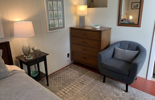 Sleeping - There are 2 bedrooms off the main floor with a queen-sized bed in each and a QS sleeper sofa in the living room. There is a twin bed and a half-bath downstairs. Bathrooms - The main bathroom, accessed thru the master bedroom, has a wonderful shower with a fantastic skylight. The half-bath is in the lower level. The Levels - There are 2 steps separating the living room area and kitchen as well as up to the master bedroom and bath. There is a stairway leading down the the lower sleeping area (twin bed) and half bath. The house is entered from the lower level and interior stairway or exterior stairs and upper deck. We can accommodate up to 6 people.