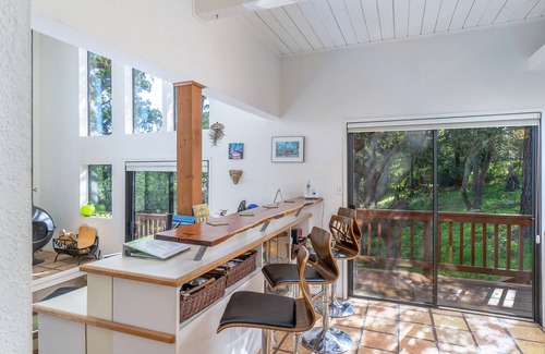 Tucked away in the wooded hills of a peaceful residential neighborhood, this mountain-view retreat is only a 5-minute drive from Moonstone Beach Park and the artist community of Cambria.