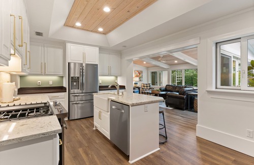 A few steps out of the living room you enter the open concept kitchen, with a gas stove, single serve Keurig, and plenty of utensils, pots and pans for use during your stay.