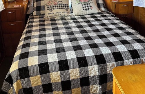 You are immediately greeted by a vintage red click-clack couch draped with a hand-made crochet American Flag blanket with a matching chair tucked in the corner for reading. There is warm birch wood cabinetry enveloping the entire space and an electric fireplace in a corner of the living room. The decor is white and black checked rugs, bed coverlets, pillows, and towels with red, white, and blue dotted throughout. The living room opens to the kitchen area with benched seating for meals with an original red table and countertops. The kitchen comes fully equipped with everything you need for cooking to include an electric stove, refrigerator, and microwave, as well as a Keurig coffee maker. The bathroom is small but comes with a shower, sink, towels, etc. There is a full-size bed with two small side tables. In addition, to the nicely appointed interior, you will find your own personal covered sitting and dining area outside. There is a common firepit, grill, and sitting area.