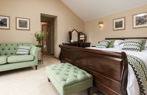 The old stable block has been recently converted into a large elegant luxury suite. The bedroom has a light and natural feel with a stunning mahogany suite of furniture, four large roof lights, stylish green soft furnishings and a limestone floor. Meanwhile, the living room offers a sleek, modern kitchen and comfortable seating area, aswell as a glazed screen overlooking your own private garden. To top it all off, there is a relaxing hottub.