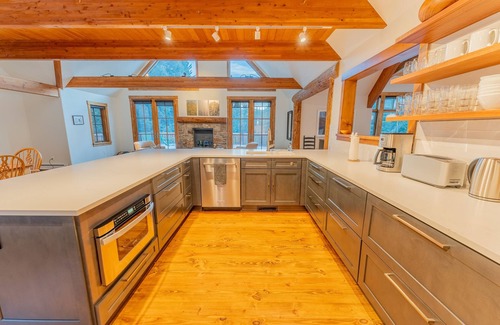 Upon walking in the front door and walking up one flight of stairs, you'll find the inviting spacious open plan. The kitchen/dining area is centered around a spacious island with stools and a casual table that seats 8-10. Make use of the large, recently remodeled kitchen, complete with all new appliances and everything you need to either summon your inner chef or warm up one of the many take out options from town. This area is complemented by a cozy seating area with fireplace and access to the deck.