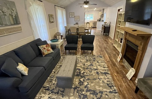 Living room has an electric fireplace, huge smart tv, queen sofa sleeper and plenty of comfy seating. Dining area for 6 guests to enjoy their meals and/or playing board games/cards. Lots of storage and space for someone to also have an extended stay…. Closets, cabinets, pantry, and a full-size indoor laundry room with shelves and cabinets too.