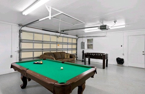 We have a game room that comes complete with a pool table, fooseball table, kids corner, projector for movies, and couches.