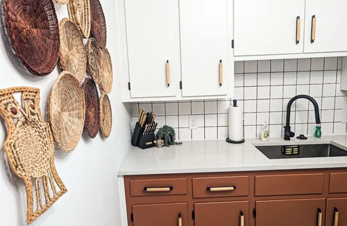 This updated 1960s apartment is spacious, light, and airy. With a huge closet, full private balcony, and cozy king & queen beds, this space is perfect for a getaway of any length. With curated touches and color palette aligning with the tiki theme, this recently renovated apartment is quirky and fun. Original details, like the patterned breeze block, hardwood floors, brass and wood sliding doors were preserved to maintain the apartment's midcentury charm.