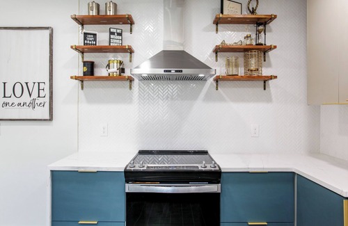 Step inside to discover a stylish, artsy, swanky, mid-century modern and comfortable living space, which features Scandinavian-inspired decor, three spacious futon sofa beds, and an abundance of natural lighting. Relax, socialize and unwind in the living room with natural lighting from the windows, dining table and Mediterranean & African style art in the living room called the Sunset Red Velvet. Use the FREE 5G WiFi to plan the next day's adventures. Gaze at the tantalizing, exotic and breathtaking views of pond and outdoor furniture for lounging, napping and having a divine meal through the large sliding glass doors. Open the sliding glass doors during the morning to embrace the sunrise or evening to drown deep inside the sunset and feel the natural soothing breeze flow through your essence.