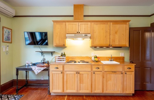 The Victoria Suite is located on the 2nd level of our restored heritage home. It is a private 1 bedroom suite which contains one bedroom with 1 queen bed, 1 full bathroom, and a family room with a kitchen, dining table and a set of single bed sized bunk beds. There is a deck off of this room with a view, outdoor dining furniture and a retractable sun awning. The guesthouse is equipped with A/C, Wifi, Smart TV, and off street parking.