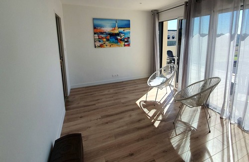 This house has just been finished. Located 200 meters from the port, it can accommodate up to eight people with its 4 bedrooms and 3 bathrooms, two of which are ensuite. This Villa is very comfortable and enjoys a small sea view from the upstairs terrace. It has a garden, a garage, a 5-seater Jacuzzi and a swim spa, both of which are in an independent covered building offering a beautiful wooden beach. Here, you will enjoy your holidays with family or friends, the beach at foot distance, the seafood you can pick up 200m from the port and the restaurant / lounge Le Théven which offers local and quality cuisine in an exceptional setting, facing the sea.