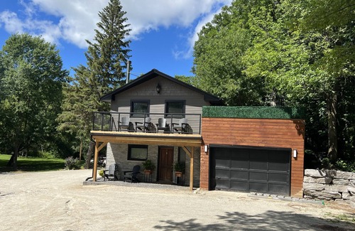 BOOK 2 NIGHTS GET 1 FREE!! (Does not include holidays) The woodlands treat is truly one of a kind! Located on a beautiful 2 acre lot with the silver creek running through the property. Huge level yard perfect for games. Outdoor fire pit and large armour stone patio with gazebo. Small Sandy beach area for kids to play in the sand and have fun in the water! It is only a 2 min drive to Blue Mountain village. Have fun with the whole family/friends at this stylish place!