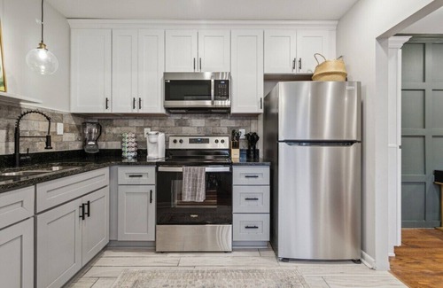 The kitchen is fully stocked with all basic cooking materials, a full fridge and freezer combo, oven, stovetop, and microwave. The bedroom features a Queen bed with ample storage in the deep closet, and an attached full bathroom.