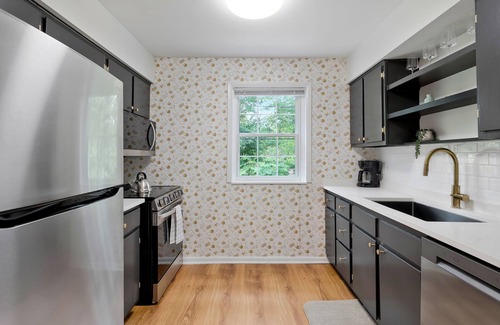 Welcome to Commodore’s Quarters—your ultimate Vandy getaway, bursting with school spirit and Commodore pride! This stylish one-bedroom, one-bathroom apartment is decked out with custom Vanderbilt-inspired wallpaper in the kitchen and Vandy artwork throughout, setting the perfect tone for your stay.The bedroom features two queen beds, room-darkening curtains, and a ceiling fan to ensure a restful night’s sleep. The bathroom includes a combo tub/shower for a relaxing soak or quick refresh. Whip up some game-day snacks in the full kitchen, then enjoy them in the handsome dining area. After a day of exploring campus or Downtown Nashville, working hard, or cheering on the Commodores, kick back in the bright and spacious living room. The sofa even transforms into a bed, so you can host two more of your Vandy crew! Step outside to the community outdoor space, where you can unwind in Adirondack chairs under cafe lighting amid tasteful landscaping. Easily ride your bike to Vanderbilt or take a walk/jog to Centennial Park using the Richland Greenway conveniently located at the end of the street.