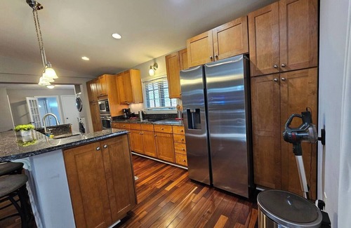 This charming two-level home offers the perfect mix of space and convenience. The main level features a luxurious primary bedroom with a king bed, a second bedroom with a double bed, a bright living room with high ceilings, and a fully equipped kitchen with ample counter space and a bar counter.