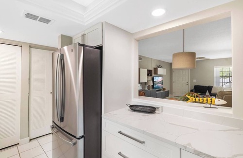 Located in the heart of Englewood, FL; this adorable condo makes the perfect retreat for your long term getaway, week long summer escape or weekend staycation. The vibe is warm and welcoming and you will feel right at home. Screened patio at the front to sit back, relax and enjoy your morning cup of Joe. Close enough to the Gulf to feel the breeze and smell the salt in the air. Kitchen is fully stocked and perfect for those who like to cook at home. A restful slumber will be had, snuggled in the King sized accommodations of the main suite. The convenience of an updated, attached bathroom. Equally accommodating guest bedroom with two twin beds. For those on a working vacation, the Wi-Fi is strong and there is cable tv in place. Just a short 2 miles and your toes will enter the warming sands and the healing waters of the beautiful Gulf Beaches at Manasota Key. Englewood remains a secret treasure where the beaches are not crowded and the area is not over run by big box stores. Quaint appeal. Great area for shelling and shark tooth hunting. The community has several charcoal grills throughout for use. Safe, secure and friendly community where neighbors become fast friends. Bring the tennis rackets, as the court is adjacent to your unit. The pool is spacious, welcoming and warm yar round. Great place to meet new people.