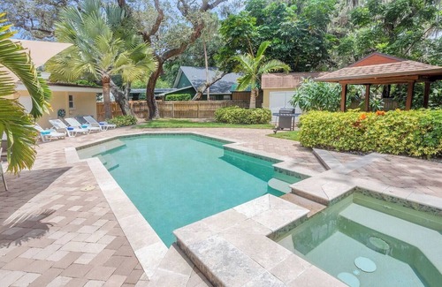 This home as a beautiful lush and Tropical backyard that will become your personal oasis to come home to after a day of sightseeing. The private pool is heated and lounge chairs for catching some rays as well as shaded outdoor seating. The gas grill and gazebo are also nice for grilling steaks or BBQ for your pool day.