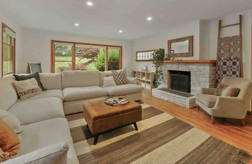 A 2BR, 1BA home with a bonus bedroom in the lower level. This beautiful home offers spacious living areas including the 3 season porch, large living room with kids play area and comfy sectional as well as a lower level family room with workspace. A fully equipped kitchen and dining room allows for easy and delicious family meals at home.