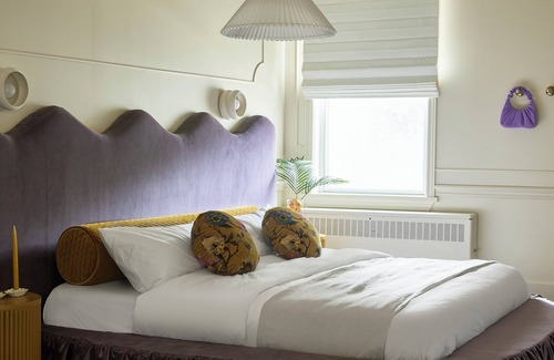 This neutral flat packs a punch with a unique and interesting feature—a round king size bed! Our signature custom wiggle headboard paired with a round bed base makes for an unforgettable experience.