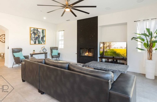 This beautiful, newly renovated home features an open and airy living space that opens up to the backyard oasis through ceiling high sliding doors. Forget the beach, this backyard includes a pool, a waterslide, and 3 palapas (or thatch covered shades) so that you can properly enjoy even the hottest California summer sun in style. Also included is an outdoor BBQ and tons of family fun. Our stunning dining room offers a table large enough to seat 12 - perfect for a family gathering! Extra seating is available at the bar and outdoor The home has 4 bedrooms and 4 bathrooms, 6 beds (2 kings, 3 queens, and 1 queen luxury air mattress), and can comfortably sleep 12. The kitchen is fully stocked with all of the essentials for cooking up a storm and we offer fast-wifi so you can work-from-home (vacation style).
