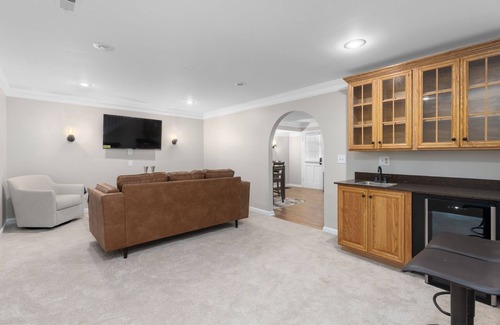 New large and stylish modern luxury terrace that is fully furnished and offers everything you need and more. This spacious and elegant terrace or walkout basement features a full kitchen, a bedroom, a living room, and a bar with a wine cooler, all tastefully decorated with high-quality furniture and appliances.