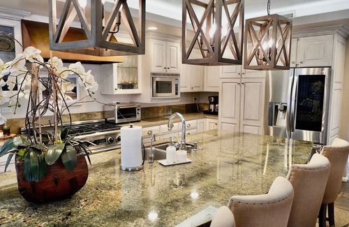 5 bedroom, 1 studio apartment with a full size bed, 5 full bathrooms and 1 half bathrooms ,kitchen in main house and kitchenette in studio, salt water pool, spa, hot tub , tennis court, basketball, play set, office, and fire pits on the porch with rocking chairs to enjoy the view. All sports equipment for tennis and basketball provided along with yard games, shuffle board ,ping pong table, 2 cardio Equiptment, yoga mats , weights , Infrared sauna. Heating pool is is $65/per day Uv lighting installing in the Hvac system to help keep everyone healthy!