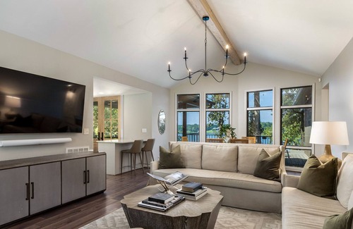 The property also boasts a boathouse/dock equipped with Wi-Fi and a television over a large bar with a refrigerator, providing an additional space to unwind. Gather around the firepit, built to accommodate 8 people, and enjoy meaningful conversations complemented by awe-inspiring views. Retreat to the gigantic master suite to soak in the tub, or lay in bed while gazing out of the beautiful French doors overlooking the lake. It's the perfect setting for a memorable getaway, offering every amenity to ensure your stay is as relaxing and enjoyable as possible.