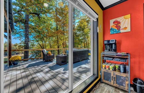 The kitchen opens to the huge composite deck with several tables and chairs for eating, drinking and lounging. There is also a new gazebo with cooling fan directly outside the kitchen for entertaining rain or shine. Under the gazebo is a large 8 seat fire table and a new propane gas grill. We've also got a competition size custom corn hole set that you are welcome to use.