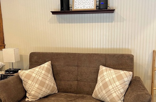 Fun is waiting for you at this fantastic tiny cabin, Cabin in the Laurels (A). This cozy retreat offers AC, heating, WiFi, and a hair dryer for your convenience. There is a queen bed and queen sofa bed for extra space. The tiny kitchen is well equipped with a microwave, countertop multiuse oven, coffee maker with full pot side and pod side, dorm style refrigerator, countertop ice maker, and 4 slice toaster. Dishes, flatware, glasses and other kitchen utensils are available, also. The attached deck is cool and enjoyable with 4 chairs, a table and grill. The picnic space just a few feet away with picnic tables. (This area will eventually be shared with the twin cabin across the way. Enjoy a relaxing stay in this gorgeous cabin, surrounded by nature. There are bicycle trails and walking trails in the area, an 1800's historic house to tour, and Indian Fort in Old Fort, and Linville Caverns close by. Feel free to reach out to us during your stay - we're happy to suggest local spots to check out.