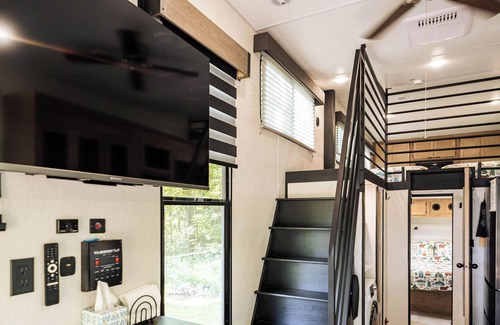 Escape to the secluded resort in the forest for a peaceful and fun-filled getaway. This two-bedroom retreat comfortably sleeps up to five guests, with a cozy camper king bed, two twin beds in the loft, and a sofa bed in the living area for extra space.