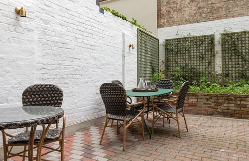 Tucked away in charming Chelsea, Tite Street IX offers four guests a wonderful slice of Central London life. This beautifully presented home is surrounded by world-class restaurants, including The Five Fields and Restaurant Gordon Ramsay (just a stone's throw away). Prestigious galleries, exquisite architecture, and splendid nightlife are all within easy reach. There’s a little something for everyone in picturesque Chelsea. Stroll along Victorian streets lined with pastel-hued townhouses or wander beside the Thames on the Chelsea Embankment – just minutes from Tite Street IX. Opulent boutiques and leading brands can be found on the fashionable King's Road, while the sophisticated Sloane Square area offers evenings of fine dining and captivating performances in gilded theatres like Cadogan Hall or the Royal Court. After a busy day, Tite Street IX is a serene spot in which to unwind. The living room soothes with calming blue accents and features a regal marble fireplace and handsome wooden dining table. A rare treat in such a central location, the home boasts a generous paved and furnished garden that can be accessed from the living room (and second bedroom). This private enclave makes the perfect spot for al fresco summer suppers with friends. Rustle up meals in the delightful blue and white kitchen, using ingredients sourced at the local Duke of York Square food market, hosted every Saturday. The two spacious, light-filled bedrooms are peaceful havens. With its welcoming earthy hues, the primary bedroom offers a sumptuous super-king-sized bed and a useful work desk. Its elegant ensuite has a gorgeous tub with a shower attachment. The second bedroom, pretty with peach and pink tones, houses a split king which can be configured as twin beds upon request. It has access to a contemporary bathroom with a walk-in shower. Tite Street IX immerses you in the coveted Chelsea lifestyle, giving you a taste of the old and the new. Indulge in a traditional British pub lunch, then browse the country's leading contemporary artwork at the ultra-chic Saatchi Gallery. With Sloane Square Station just a 15-minute stroll away, exploring every corner of the capital is as easy as can be.