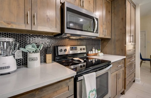 The Kitchen: Fully equipped with dish ware, pots/pans, utensils, a coffee maker, a microwave, stainless steal appliances, sugar, salt/pepper, and cooking oil.