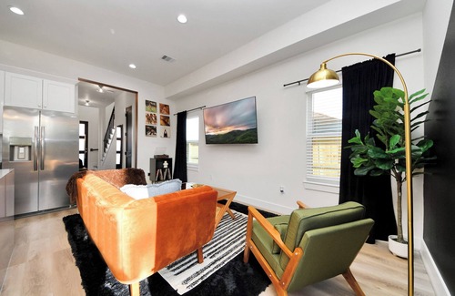 This stylish 6BR, 4BA, 2.5BA duplex offers two distinct vibes—Champagne Garden, a vibrant, celebratory space with bold décor, and Off The Record, a cozy 70s-inspired home blends modern comforts. Both units feature smart TVs in every room, fully equipped kitchens, and a spacious backyard in a gated community. Just 7 miles from NRG Stadium, minutes from the Texas Medical Center & downtown, it’s perfect for large groups and special occasions