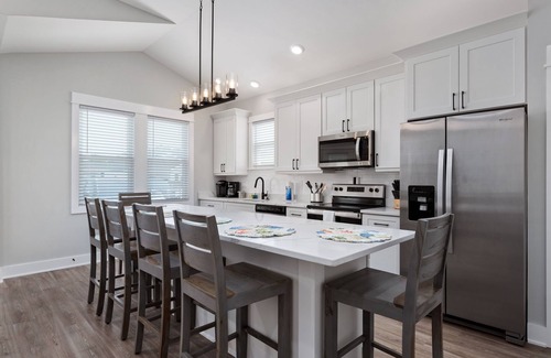 The kitchen boasts a 10-foot center island. The kitchen comes equipped with everything from pots and pans to utensils and small wares. We also provide both a drip coffee maker and Keurig for you convenience.