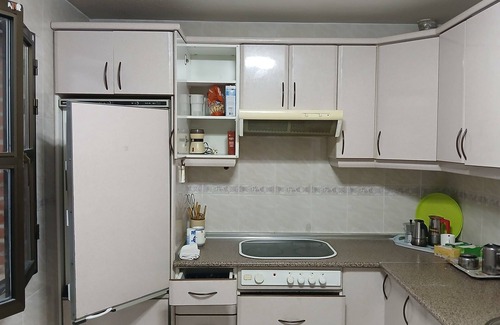 Complete kitchen ready to make your meals with ceramic hob, refrigerator, microwave, kitchen utensils such as cutlery, plates, cups, glasses, cups, napkins, tablecloths, spices, etc.