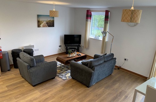 The kitchen, living and dining area is open plan with a comfy two-seater sofa and further comfy chair, coffee table, 32" flat screen Smart TV which has a basic Sky subscription and free to air terrestrial channels provided, as well as the facility for you to view your own streaming content. There is also a dining table and four chairs.