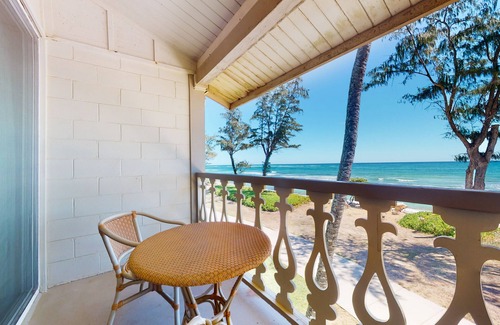Located in the oceanfront Niihau Building, your top-floor condo features unobstructed ocean views and is filled with thoughtful touches. Enjoy morning coffee and the sound of the waves on your breezy private lanai. Whip up beach snacks in the kitchenette - with a sink, microwave, mini-fridge, and coffee maker. Extras include AC, high-speed WiFi, TV, and beach towels.