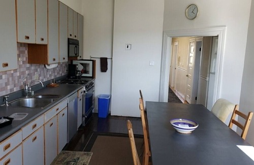 Full top floor flat with lots of natural light, hardwood floors, large eat-in kitchen, sunny sitting room, full bath with tub, and 2nd brand new bath. Beautiful period detailing in the decorative fireplace and arched French doors and windows. Our building is one of the tallest on the block so you will have beautiful views in all directions affording you a true feeling of the city while enjoying all the warmth and charm of a true Edwardian flat built in the early 1900's in a very popular old established neighborhood. Furnishings change from time to time. If you have specific needs, please discuss with owner.