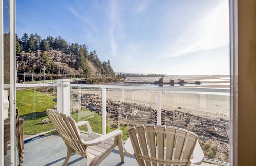 Picturesque waterfront views of Siletz Bay and the ocean inspire this beachfront top-floor condo that sleeps six. 180-degree panorama with the Three Brothers rocks adding to a mesmerizing bay view. Watch from the balcony for an ever-changing scene of harbor seal heads popping out of the water, wading water birds, or an eagle sweeping down to snatch a fish. Look west to see the ocean surf or a colorful sunset. Enjoy the cozy fireplace with a puzzle, a game, or a book in a comfy chair or watch one of the two smart TVs.
