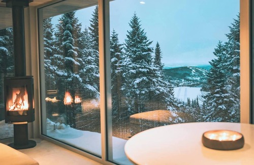 Let yourself be charmed by one of the most unique residences in the Quebec City area. With its minimalist design, this micro-home blends harmoniously into its surroundings, offering a privileged vantage point to contemplate the splendor of nature. The Topaz clings to the mountainside, revealing a breathtaking panorama. The master bedroom, located on the first floor, features a king-size bed offering an unobstructed view. The large windows allow you to admire the beauty of the landscape in every season from the comfort of your bed. A comfortable sofa bed on the second floor can accommodate two additional guests, bringing the total capacity of the house to four. All windows are equipped with solar shades for your comfort and privacy. Enjoy optimal comfort year-round with heated floors throughout the house, a heat pump system providing both air conditioning and heating, as well as a gas stove ensuring a cozy warmth even on the coldest winter days. The kitchen is fully equipped with all the modern amenities you could desire: refrigerator, freezer, dishwasher, microwave, oven, Nespresso coffee machine, and a complete set of cookware for preparing delicious meals at home. Outdoor amenities such as the hot tub, barbecue, and gas fireplace are operational year-round, allowing you to fully enjoy the outdoor terraces.