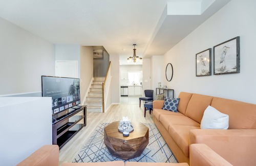 Upon entering the home, you'll see a short flight of stairs, which lead to the stunning living area with orange sofas and lots of natural light. There's a bar cart and 2 comfy accent chairs on the other end of the living room. Relax on the couches and watch your favourite TV shows on the 55 inch TV with all streaming apps, or have a drink and socialize around the bar cart.
